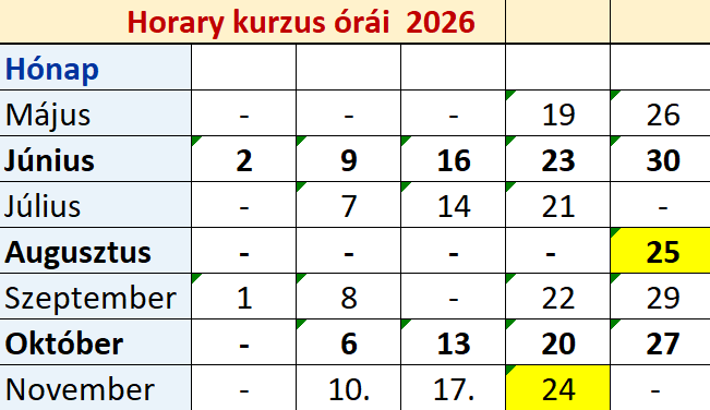 - +2 gyakorló óra van beépítve a tanrendbe, amikor csak a tanulók saját kérdéseivel foglalkozunk. Ezek az órák előbb is kezdődhetnek ( 18,00 óra) és akár tovább is tarthatnak kb.: 22,00 óráig. (lásd besárgázott dátumok)